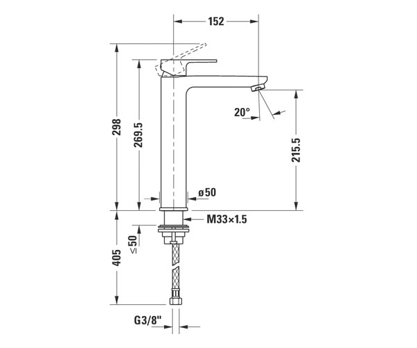 陶瓷混合系统, 投射距离 152 mm, 连接软管 3/8", 起泡器可调节, 流率 5,3 升/分钟 (3 bar), 标准喷雾, 表面镀铬, 温度范围可调节, 推荐在压力 3-5 bar下进行操作, 不带下水器套装, 270 mm